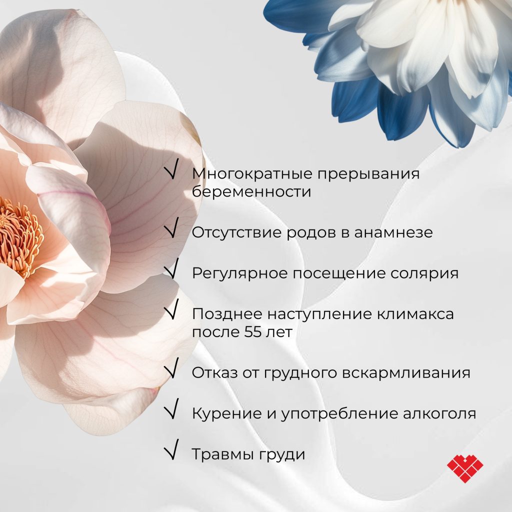 Карточка № 2: Многократные прерывания беременности Отсутствие родов в анамнезе Регулярное посещение солярия Позднее наступление климакса после 55 лет Отказ от грудного вскармливания Курение и употребление алкоголя Травмы груди