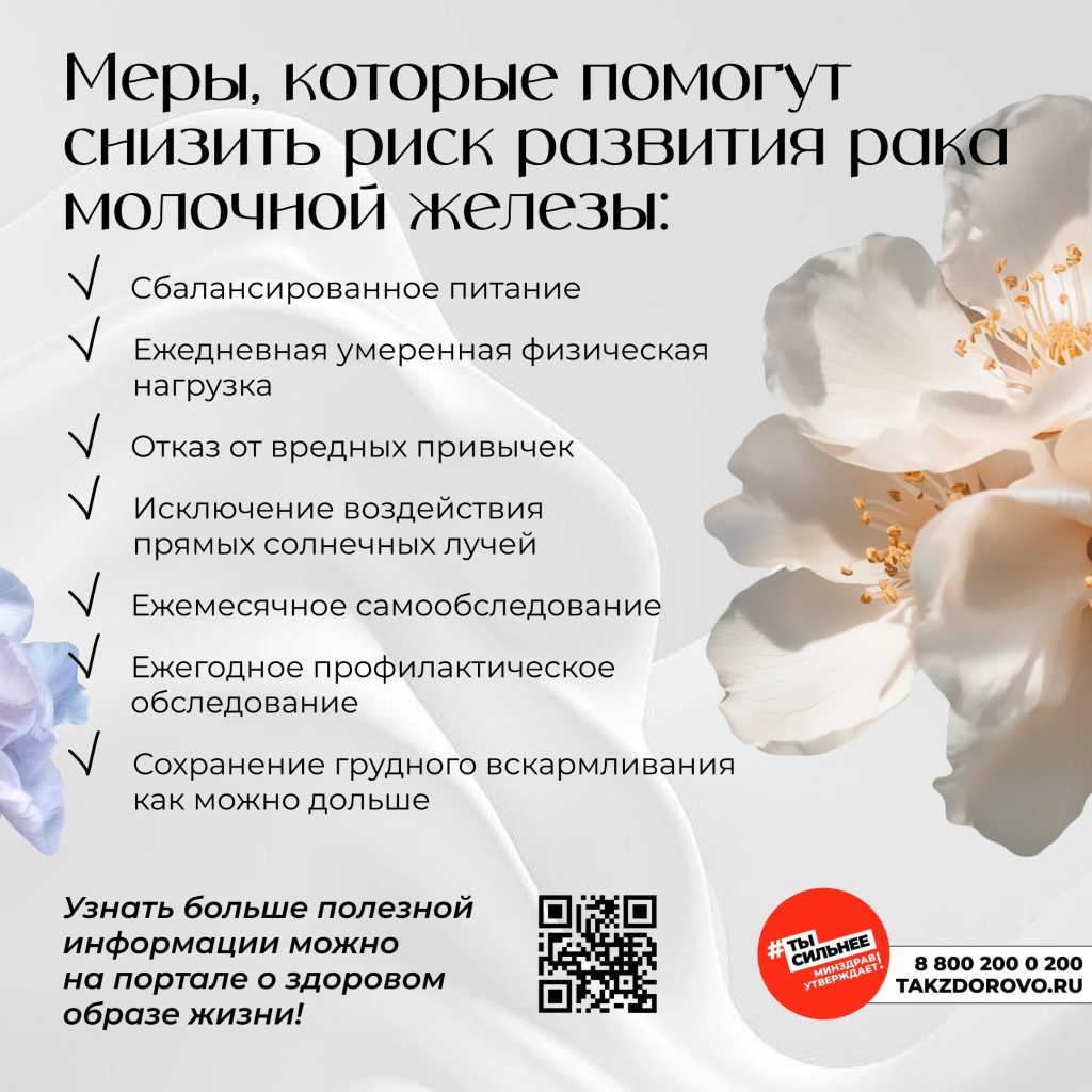 Карточка № 4: Меры, которые помогут снизить риск развития рака молочной железы: Сбалансированное питание Ежедневная умеренная физическая нагрузка Отказ от вредных привычек Исключение воздействия прямых солнечных лучей Ежемесячное самообследование Ежегодное профилактическое обследование Сохранение грудного вскармливания как можно дольше