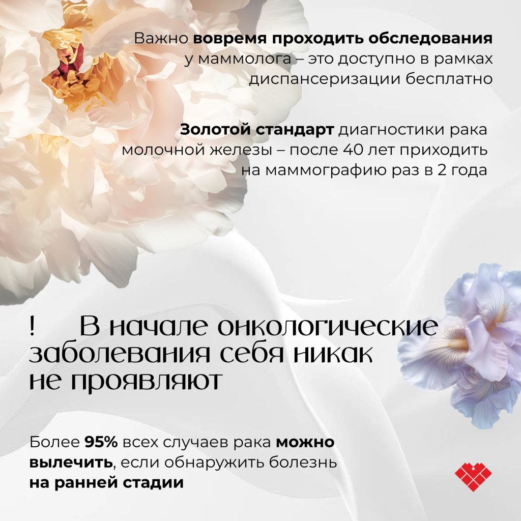 Карточка № 3: Важно вовремя проходить обследование у маммолога – это доступно в рамках диспансеризации бесплатно. Золотой стандарт диагностики рака молочной железы – после 40 лет приходить на маммографию раз в 2 года. ! В начале онкологические заболевания себя никак не проявляют. Более 95 % всех случаев рака можно вылечить, если обнаружить болезнь на ранней стадии.