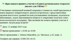 Приглашаем принять участие в “Едином региональном открытом диалоге для СВОих”! Участникам специальной военной операции и членам их семей предлагаем в новом формате доверительного диалога встретиться с представителями органов власти всех уровней на консультационных площадках, поделиться наболевшим, задать накопившиеся вопросы и оперативно получить ответ, психологическую поддержку. При желании вы можете принять участие в тренинге. Будем рады …