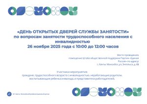 “День открытых дверей службы занятости” по вопросам занятости трудоспособного населения с инвалидностью 26 ноября 2025 года с 10:00 до 12:00 часов. Место проведения: помещение Штаба общественной поддержки партии “Единая Россия” по адресу г. Ханты-Мансийск, ул. Энгельса, д. 15. Участники мероприятия: граждане трудоспособного возраста с инвалидностью, неработающие родители, воспитывающие ребёнка инвалида, и представители работодателей.