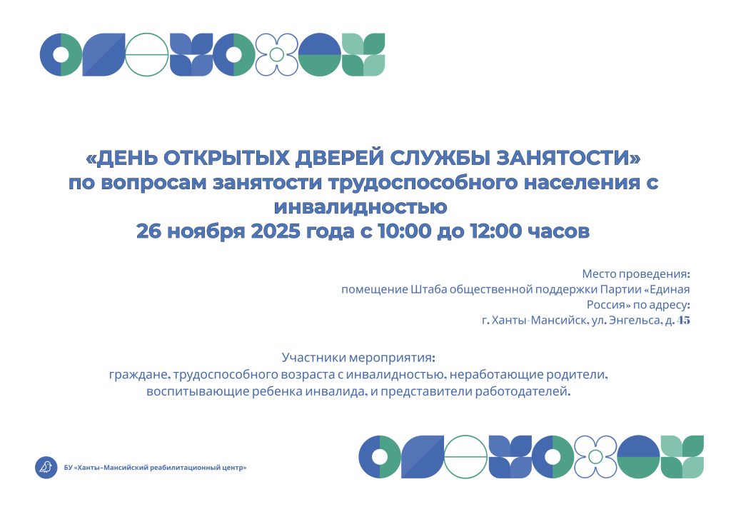 “День открытых дверей службы занятости” по вопросам занятости трудоспособного населения с инвалидностью 26 ноября 2025 года с 10:00 до 12:00 часов.